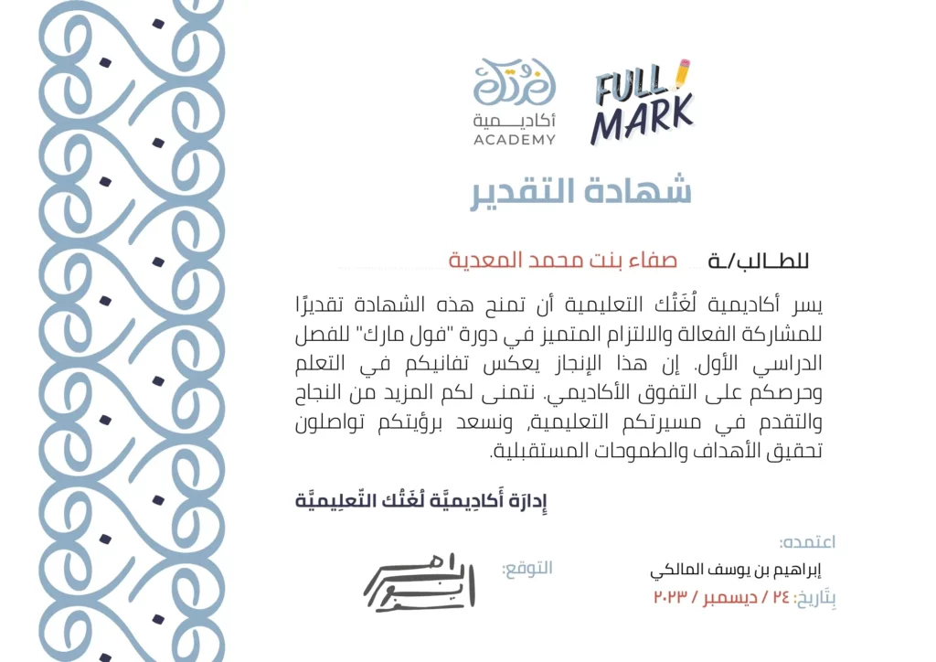 نُقدِّم شهادات تقدير معتمدة تكريمًا للطلاب المتفوقين الذين أظهروا اجتهادًا وتميزًا في دراستهم. هذه الشهادات ليست مجرد اعتراف بإنجازاتهم، بل هي أيضًا تحفيز مستمر للاستمرار في التفوق والنجاح. نحن نؤمن بأن التقدير الصحيح يُعزز من دافع الطلاب لتحقيق أهدافهم، ويُشجعهم على بذل المزيد من الجهد والتفاني.